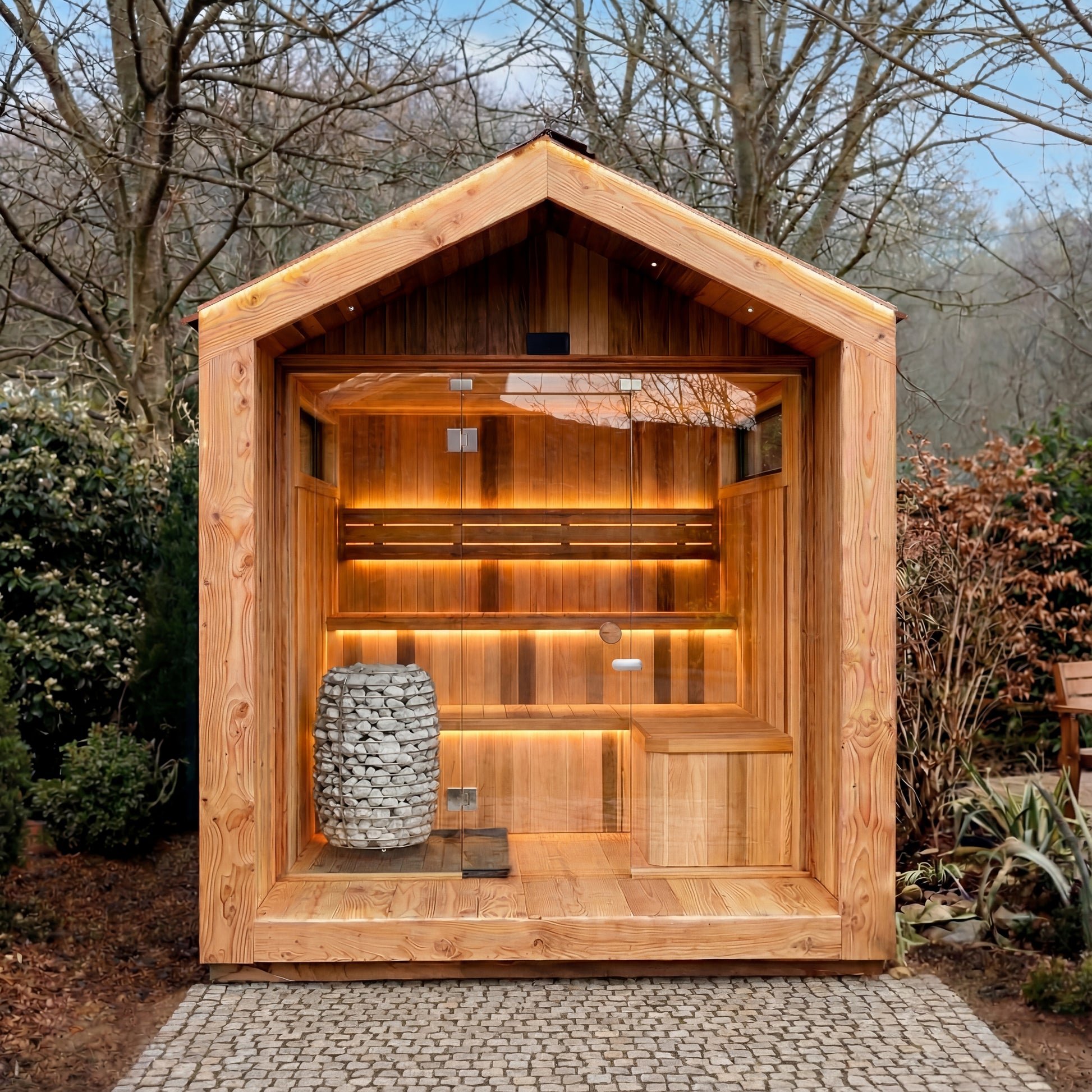 For the purist. The massive stone capacity ensures soft, high-quality steam (Löyly) and an authentic atmosphere that connects you to nature.